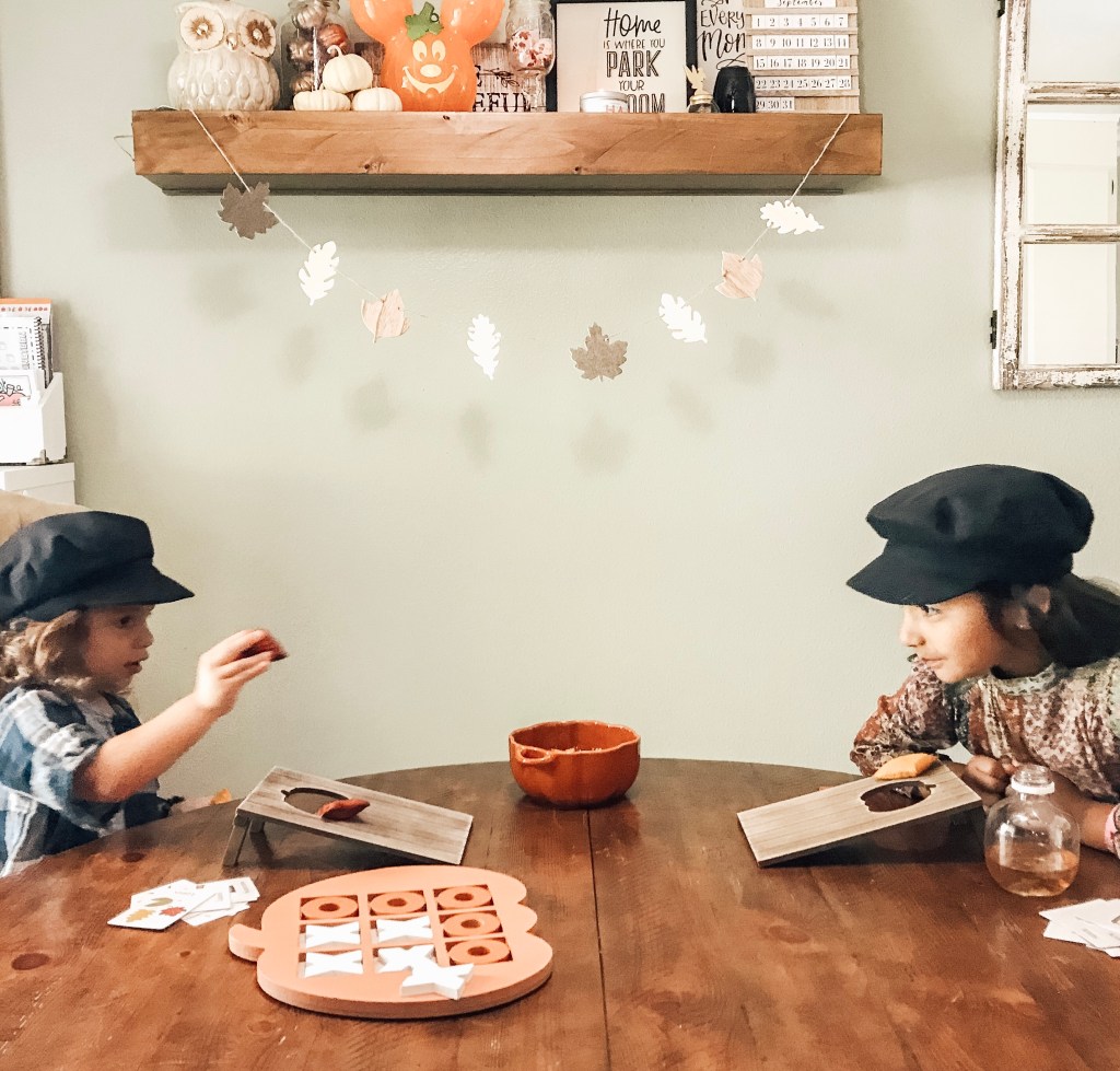 The pumpkin corn hole toss was hands down their favorite game. They loved distracting each other from getting their bean bag in the pumpkin. This game is extremely easy and was the perfect toddler size for my girls.
