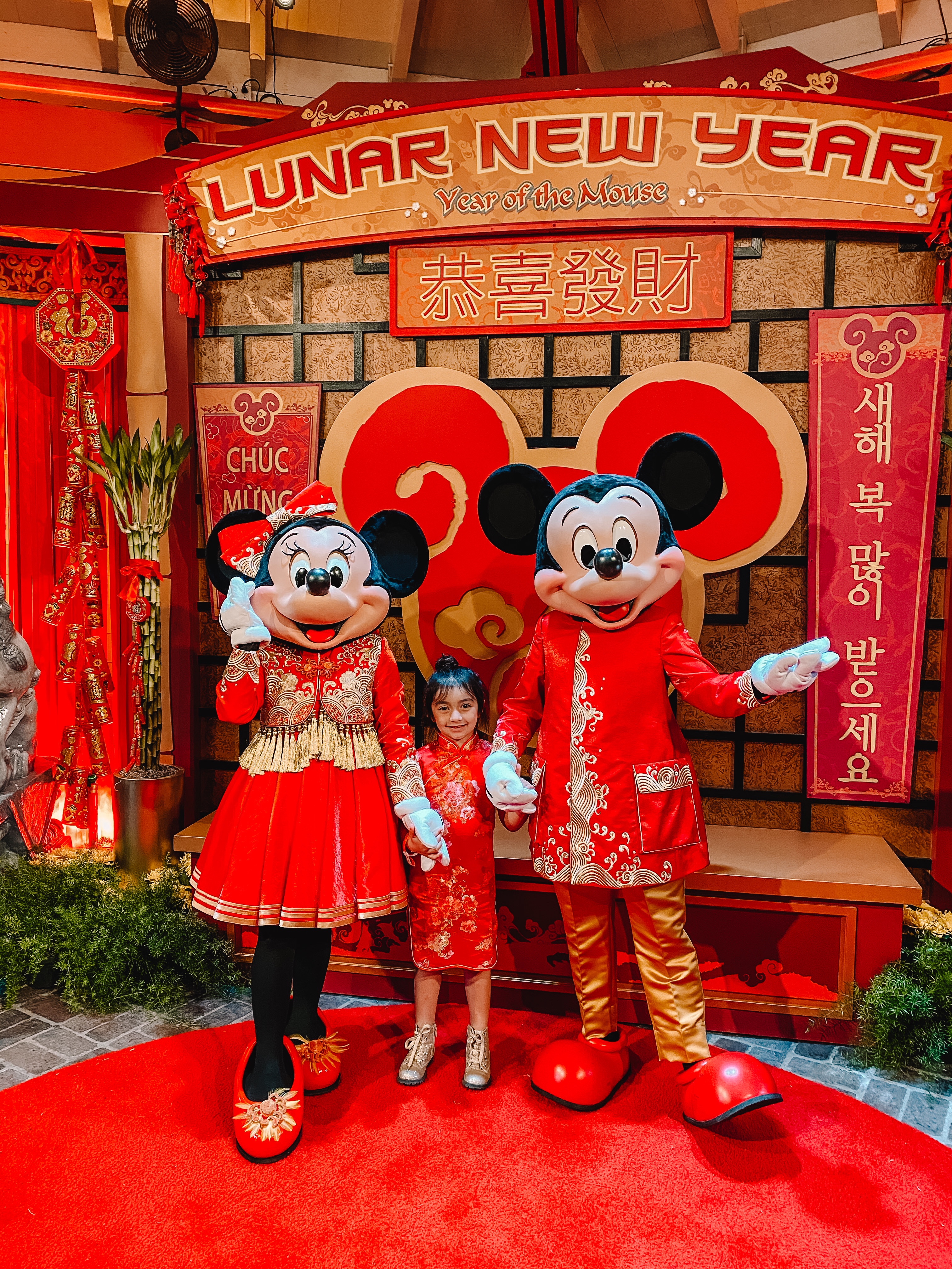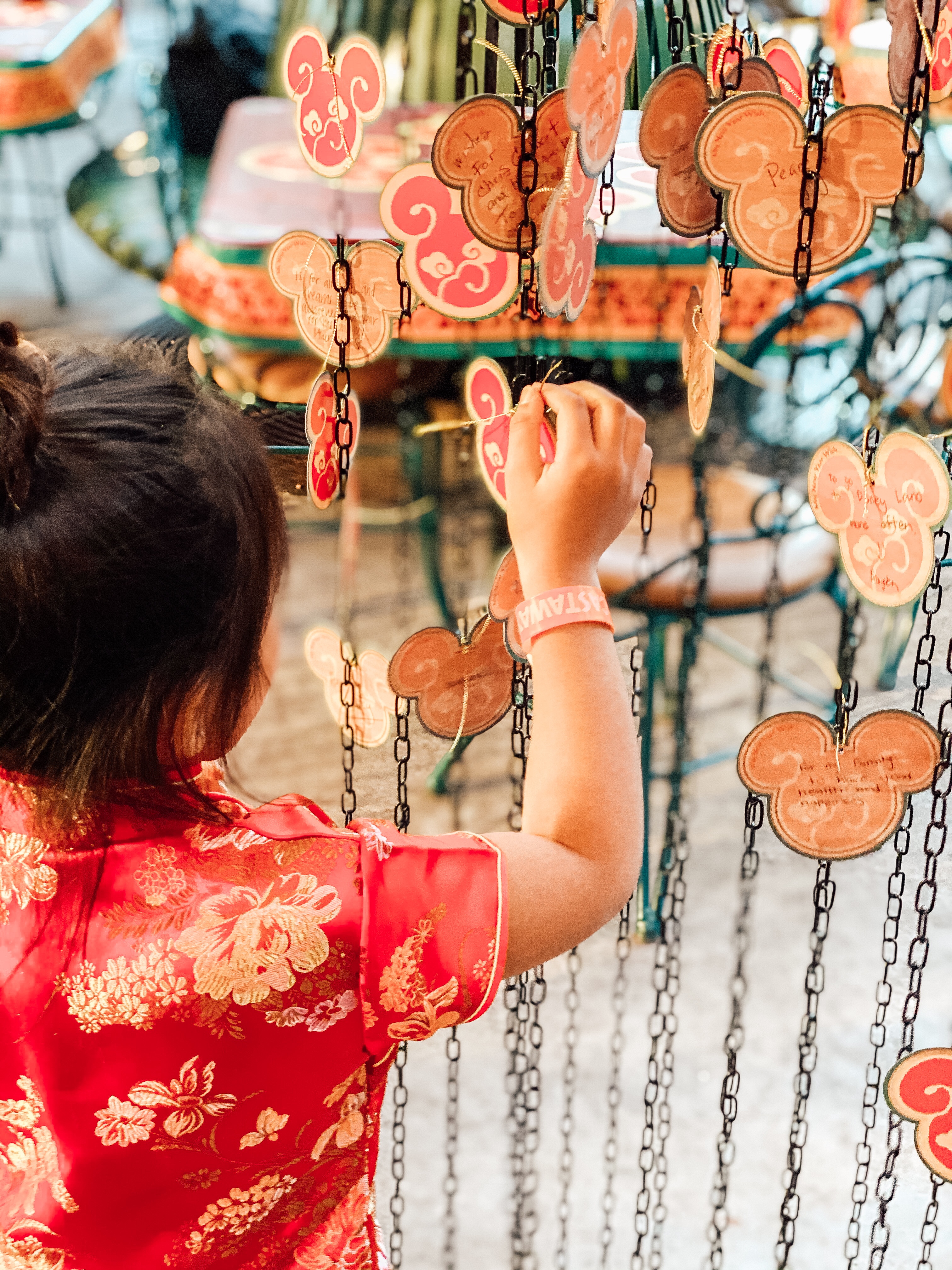 If having a chat and snapping a pic with your favorite characters (wearing their festive Lunar New Year attire) is at the top of your list like it is ours, you want to make sure to head to Paradise Gardens first. Characters can be visited between 10:30 AM and 5:00 PM daily. Characters will rotate throughout the day so if you are looking for someone special, make sure to ask a cast member when that characters will be out. The lines can get long, so the earlier you get there the better. Some characters you will see are: Mickey Mouse, Minnie Mouse, Mulan, Mushu, Pluto, and new this year the Three Little Pigs! My girls love the Three Little Pigs (they dressed as them for Oggie Boggie’s Bash this past year) so this is a big deal for us. Chip ‘n Dale can be see wondering around Paradise Gardens so it will be easy to snap a quick pic of the duo as well.