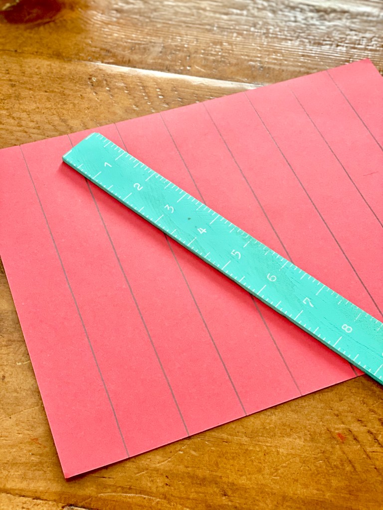 Start with your red card stock paper. Place the paper down horizontally and make straight vertical lines using your ruler and pencil all the way across the paper like in the picture.
