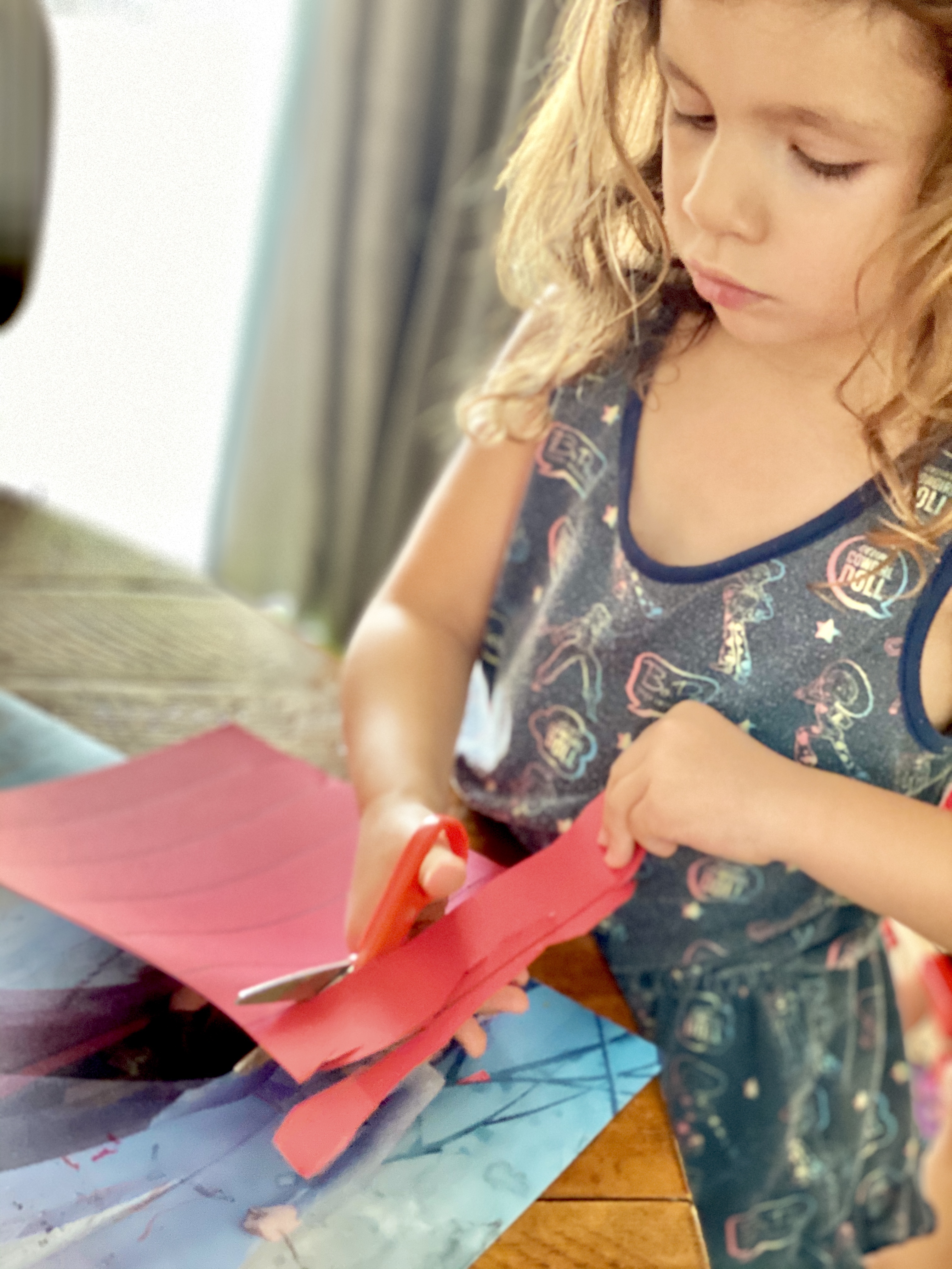 Then, have your child practice their scissor skills by cutting along the lines you traced on the red card stock paper.