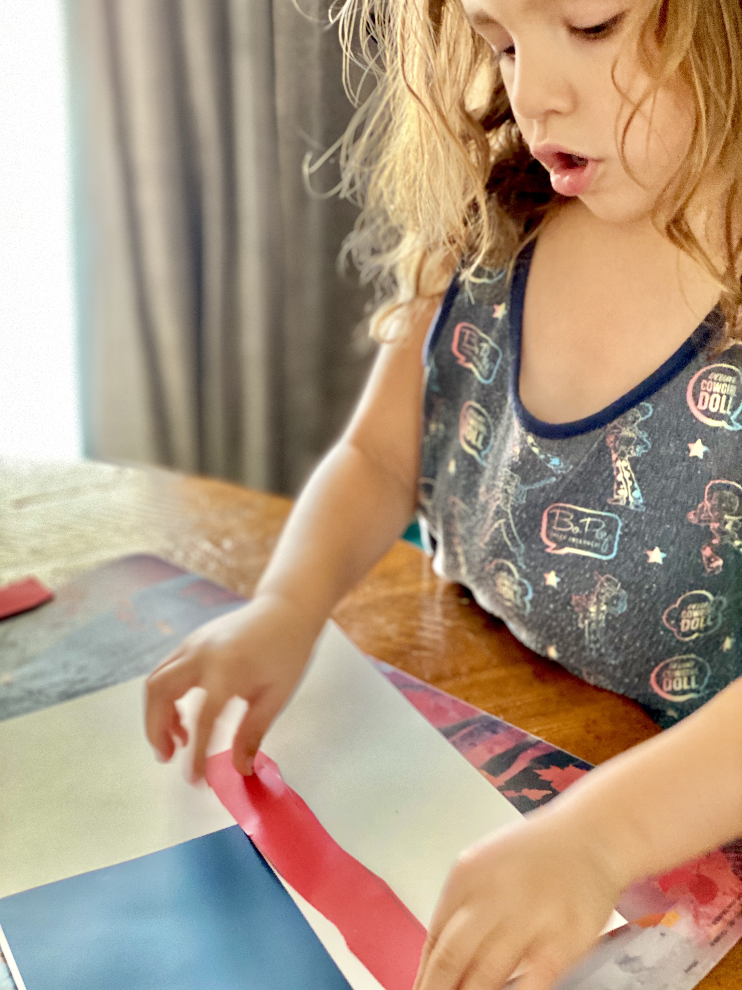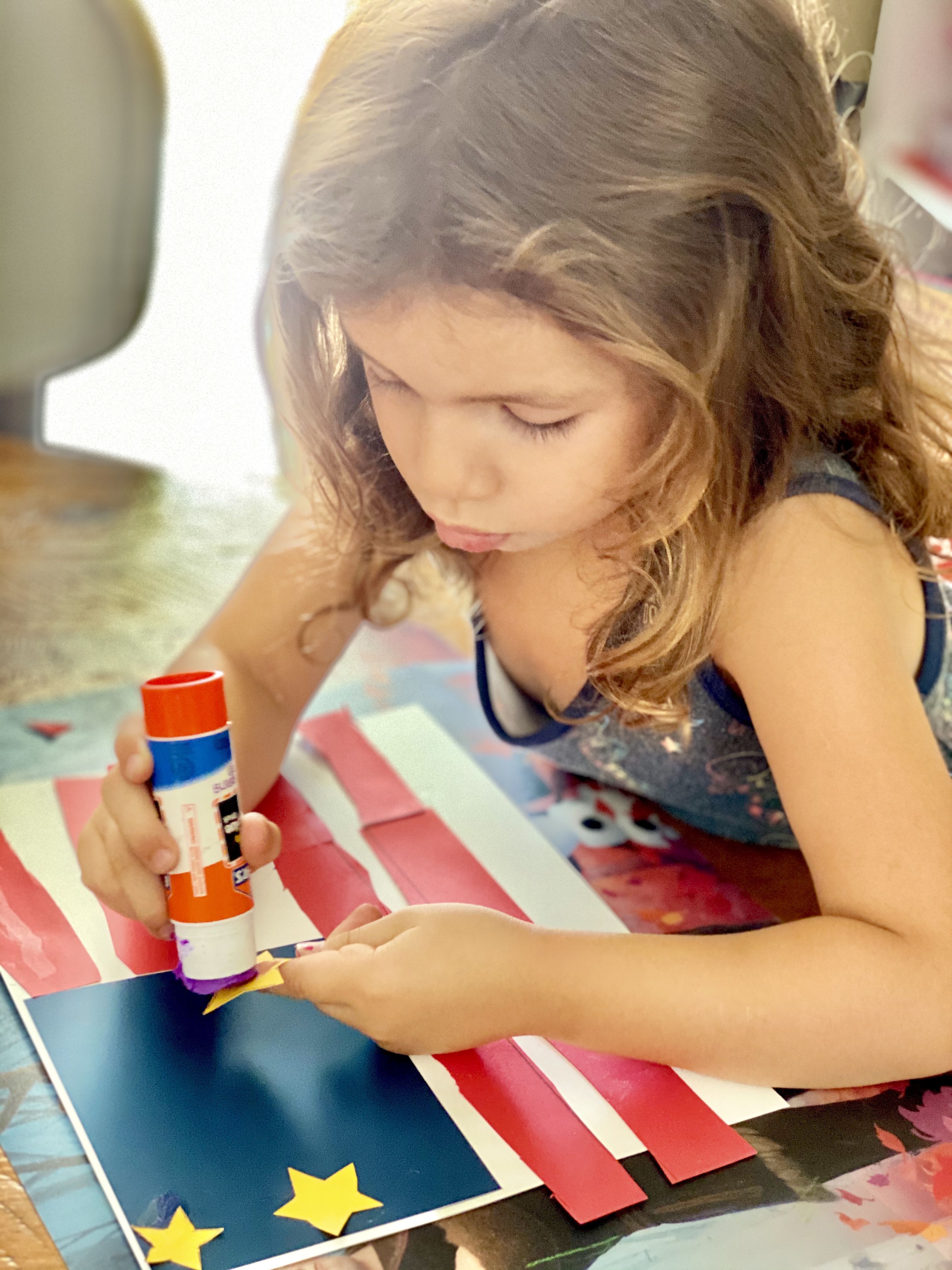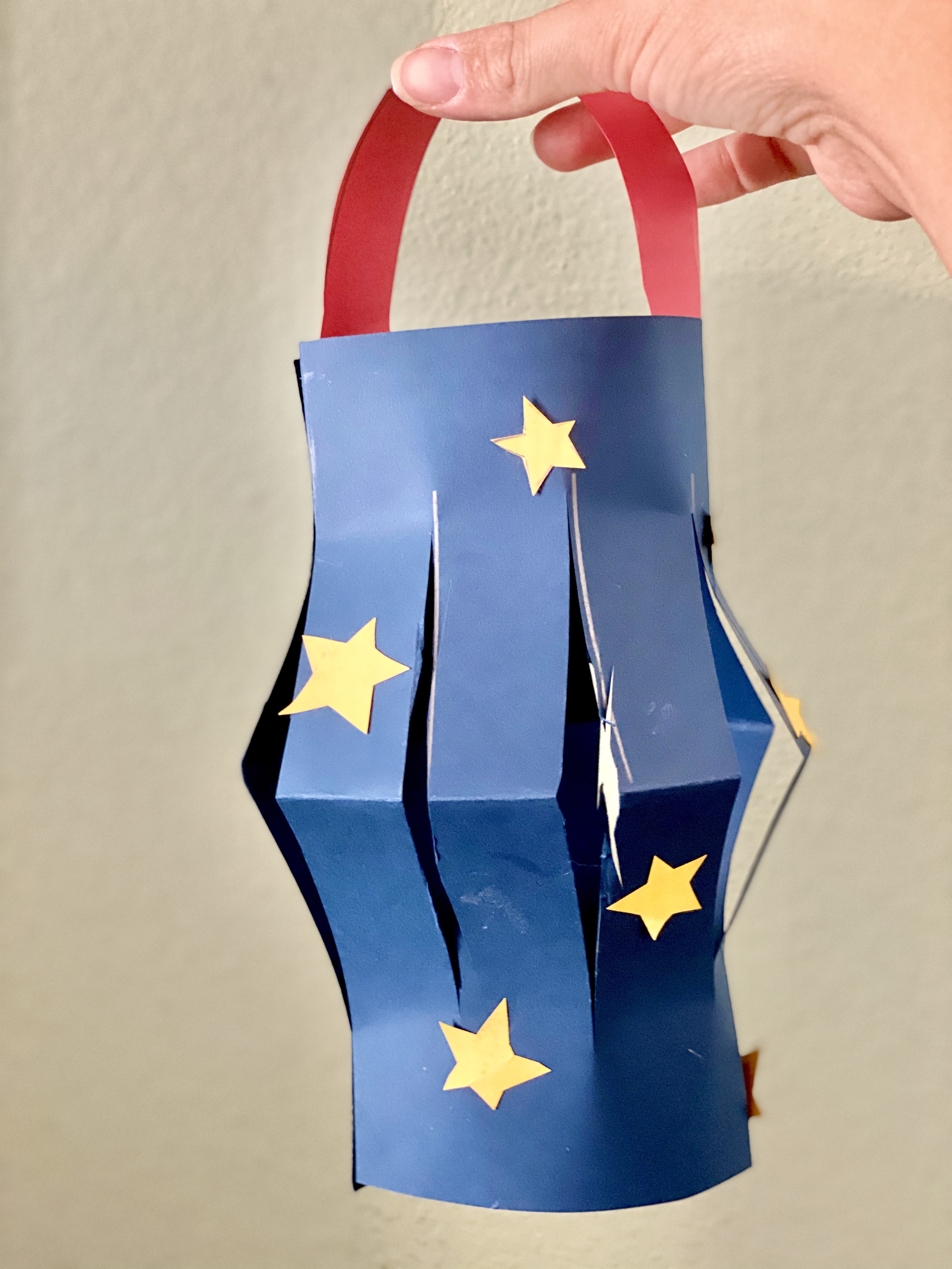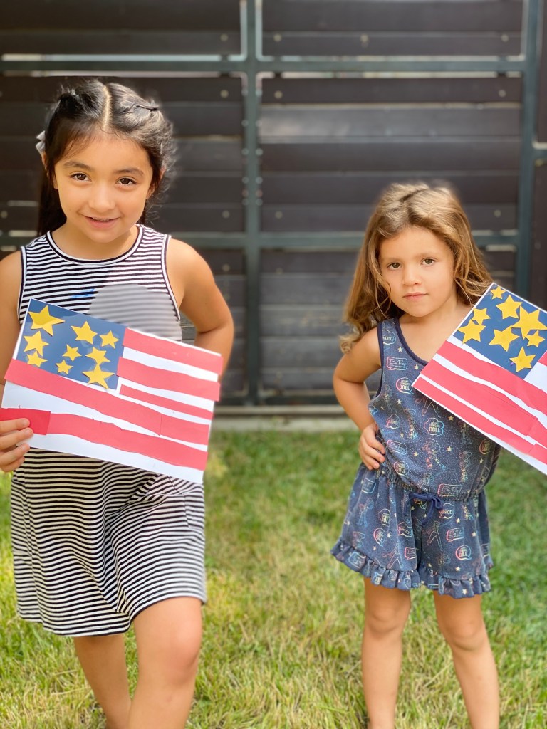Since I am dealing with a 5 and 3-year-old, it always helps to involve a craft of some kind to hold their attention. With some craft paper already on hand, I decided we would make our own American flags and patriotic paper lanterns. This is a easy craft that also helps with developing fine motor skills by practicing those cutting skills.