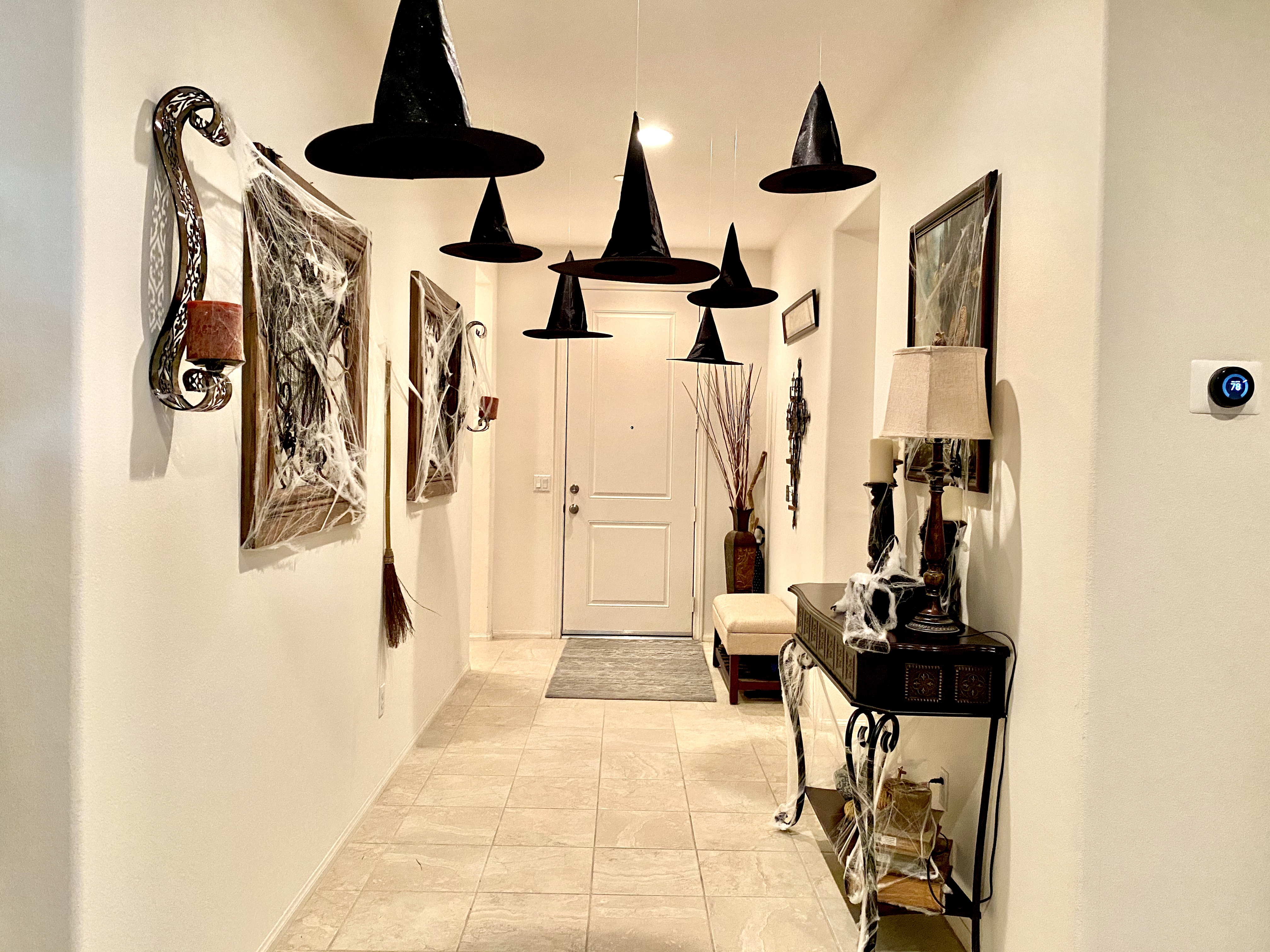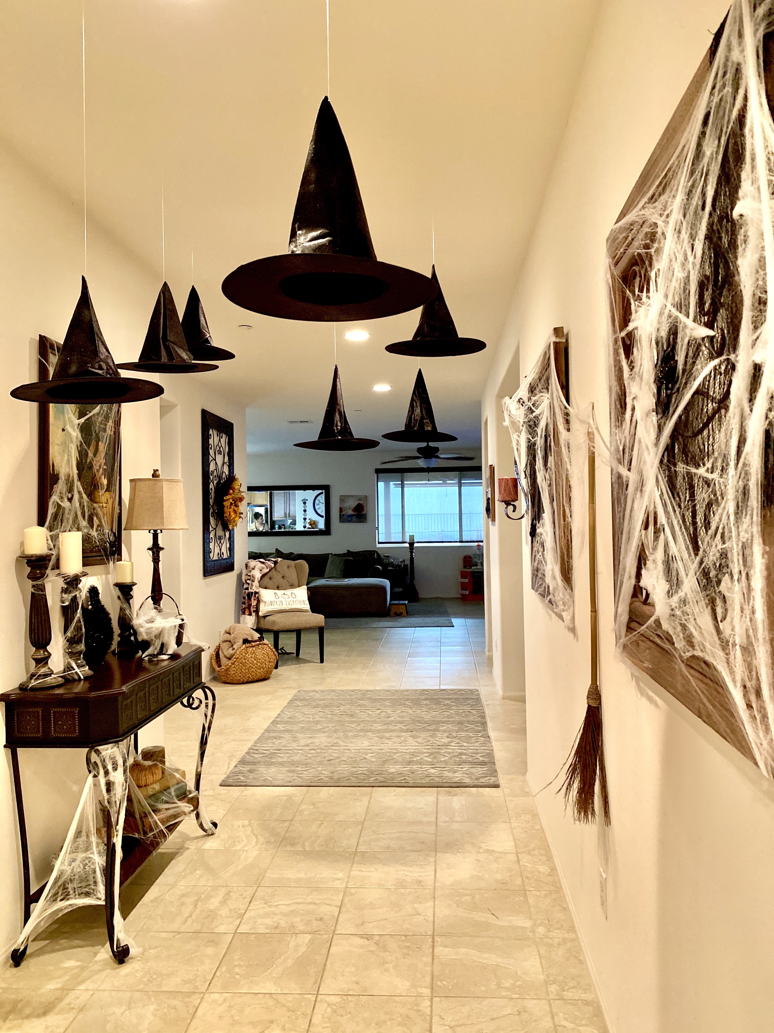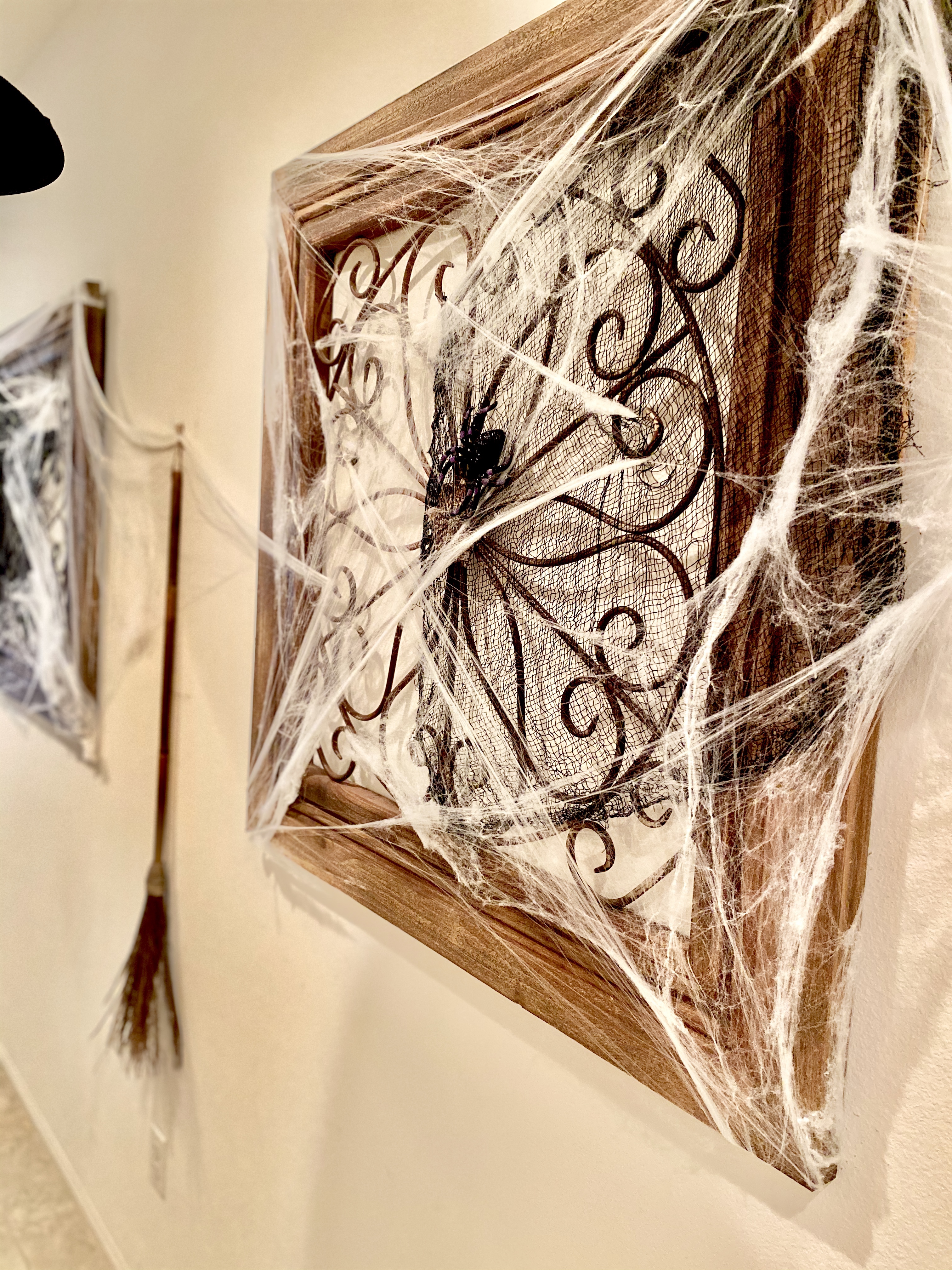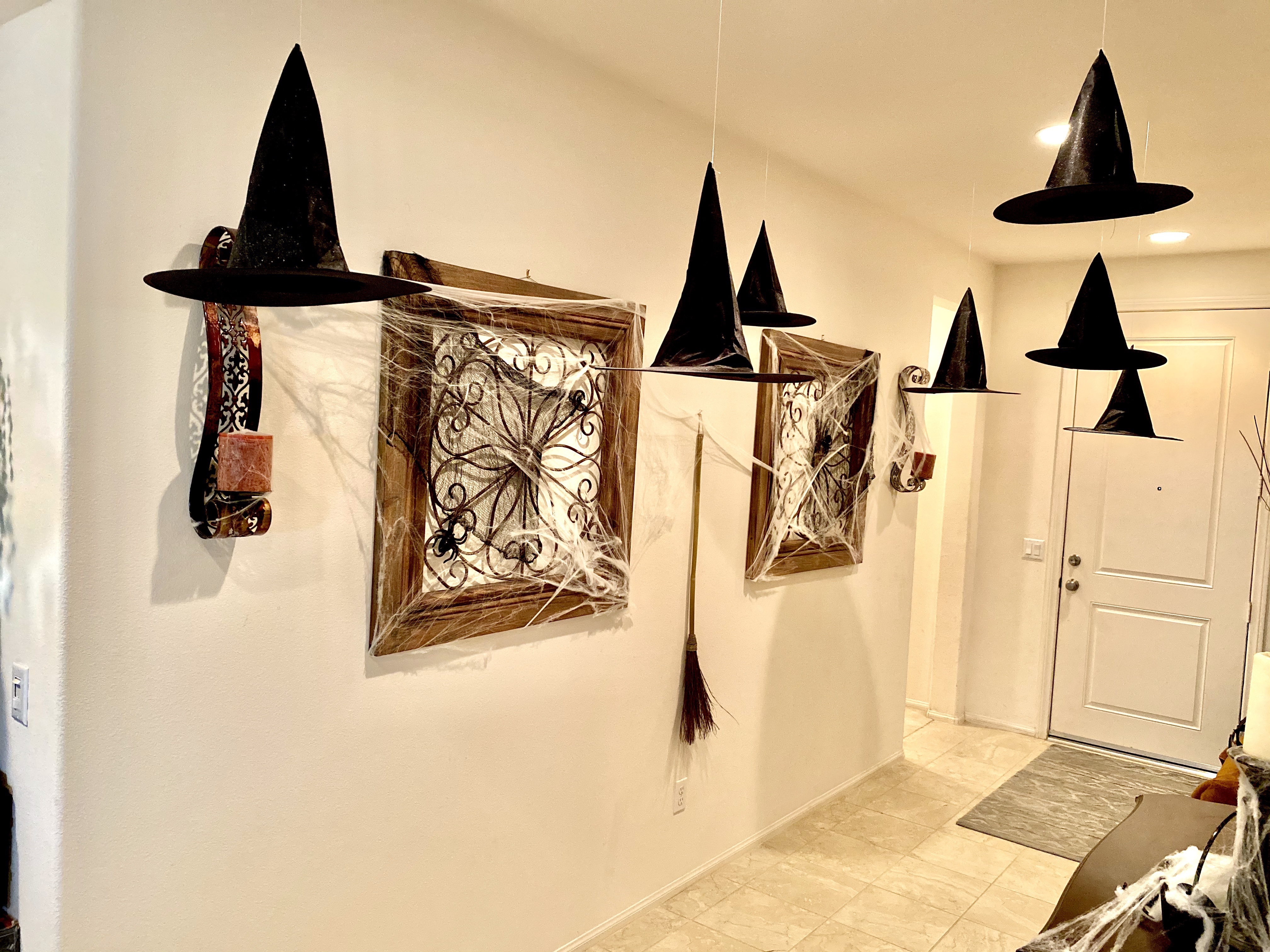 While the hats were drying from the hair spray, I decorated the wall decor of the front entrance with the spider webs, spiders and black creepy cloth. I also hung the broomstick in between 2 wall accents that were already on the wall. Decorating with spider webs is one of my favorite picks when it comes to adding a spooky touch to the house. You don’t have to remove your regular home decor, just string some spider webs and you instantly spooktify the place up. It’s fast and fuss free; my kind of decorating.