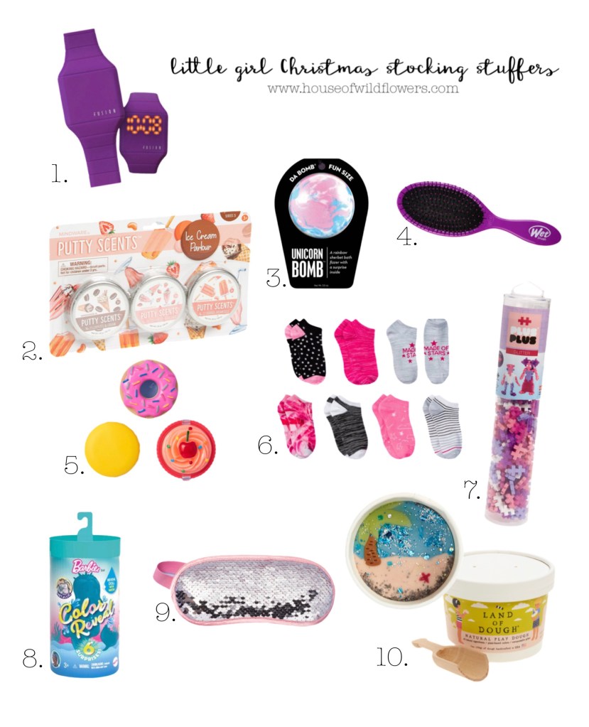 1. Hidden digital watch | 2. Scented putty | 3. Bath bomb | 4. Wet brush | 5. Dessert lip balm | 6. Socks | 7. Plus plus build kit | 8. Barbie mermaid color reveal | 9. Sleep mask Sleep mask | 10. Land of dough