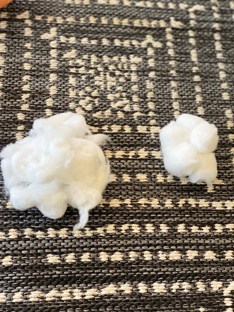Last, separate your cotton balls to make your fluffy clouds. Glue them down on the Mickey cloud outline on the paper.