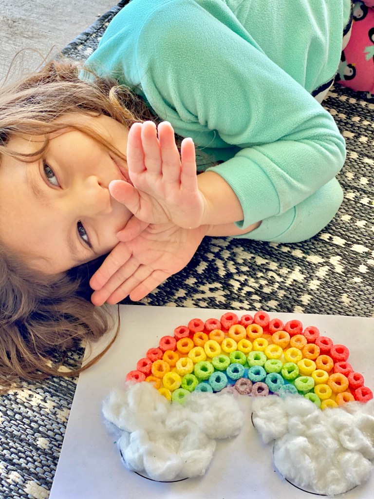 Then have your child glue on the coordinating colored Fruit Loop to the color of the rainbow. I found it easier to have them make a line of glue across a single color on the rainbow, and work in sections for glueing the cereal down.
